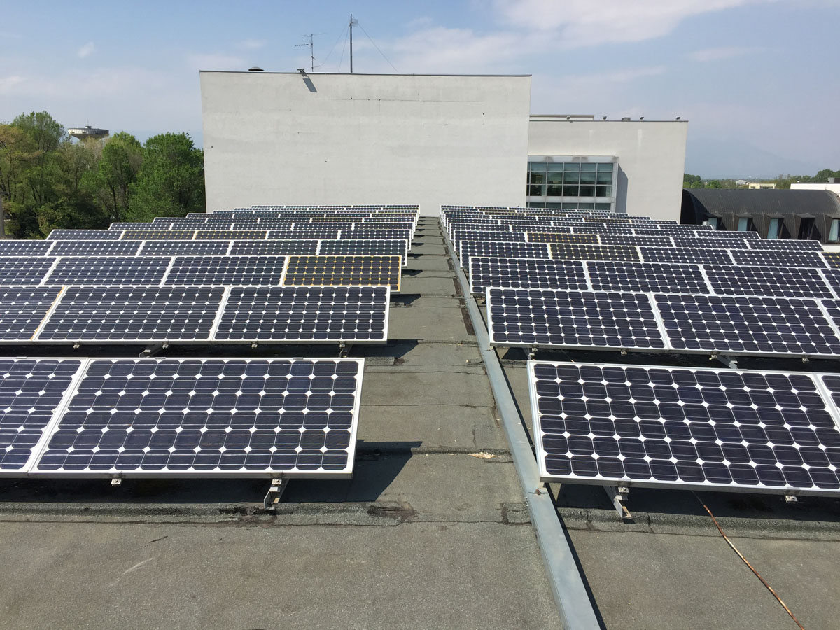 Impianto fotovoltaico chiavi in mano realizzato per il Consorzio Universitario di Pordenone, con potenza nominale di 20 kWp. I moduli fotovoltaici in silicio mono cristallino.